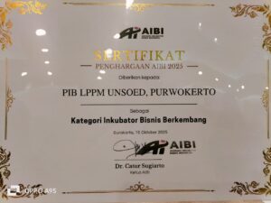 Surakarta, Pusat Inkubator Bisnis (PIB) Lembaga Penelitian dan Pengabdian kepada Masyarakat (LPPM) Universitas Jenderal Soedirman (Unsoed) kembali menorehkan prestasi membanggakan di kancah nasional. Dalam ajang AABI-AIBI Summit dan bersamaan dengan ICSIE 2025 yang digelar di Kota Solo pada 15–16 Oktober 2025, PIB LPPM Unsoed dianugerahi penghargaan sebagai Inkubator Bisnis Berkembang oleh Asosiasi Inkubator Bisnis Indonesia (AIBI).