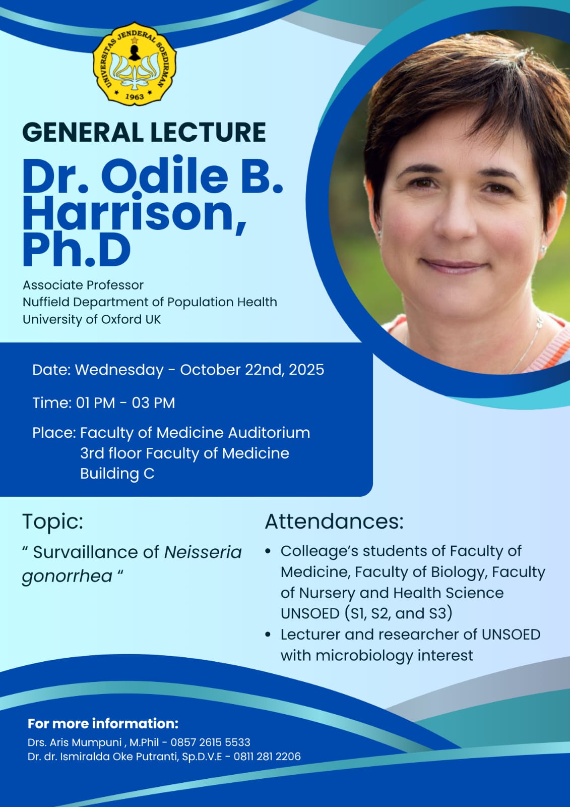 Unsoed akan menyelenggarakan Kuliah Umum yang akan dibawakan oleh Odile B. Harisson, Ph.D (Nuffield Department of Population Health, University of Oxford sebagai UK Project Leader) dengan ketentuan sbb.: