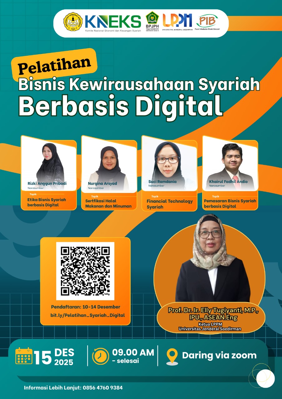 Komite Nasional Ekonomi dan Keuangan Syariah (KNEKS) bekerja sama dengan BPJPH, LPPI, Pusat Inkubator Bisnis (PIB) dan Halal Center UNSOED mengundang mahasiswa serta masyarakat umum untuk mengikuti pelatihan yang bertujuan meningkatkan kapasitas kewirausahaan berbasis prinsip syariah di era digital.