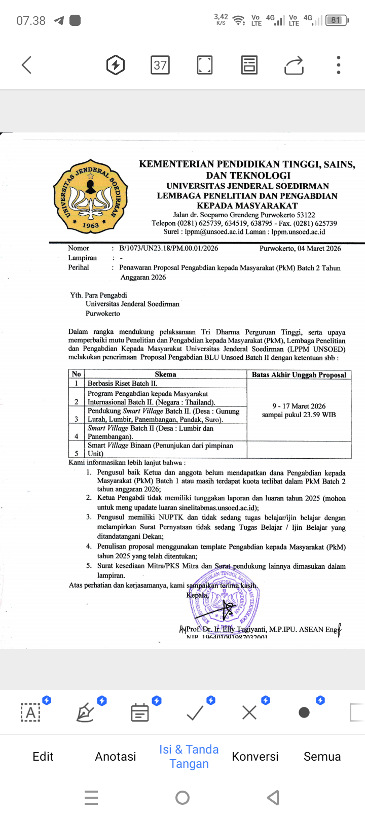 Kami informasikan terkait Penawaran Proposal Pengabdian kepada Masyarakat Batch 2 Tahun Anggaran 2026. LPPM Unsoed melakukan penerimaan proposal Pengabdian BLU Batch II dengan ketentuan sebagai berikut: