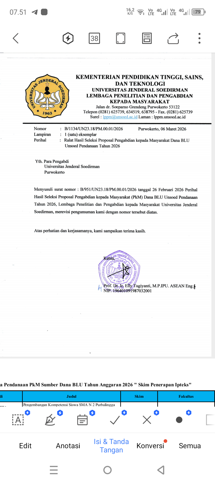 Kami informasikan terkait Ralat Hasil Seleksi Proposal Pengabdian kepada Masyarakat Dana BLU Unsoed Pendanaan Tahun Anggaran 2026.