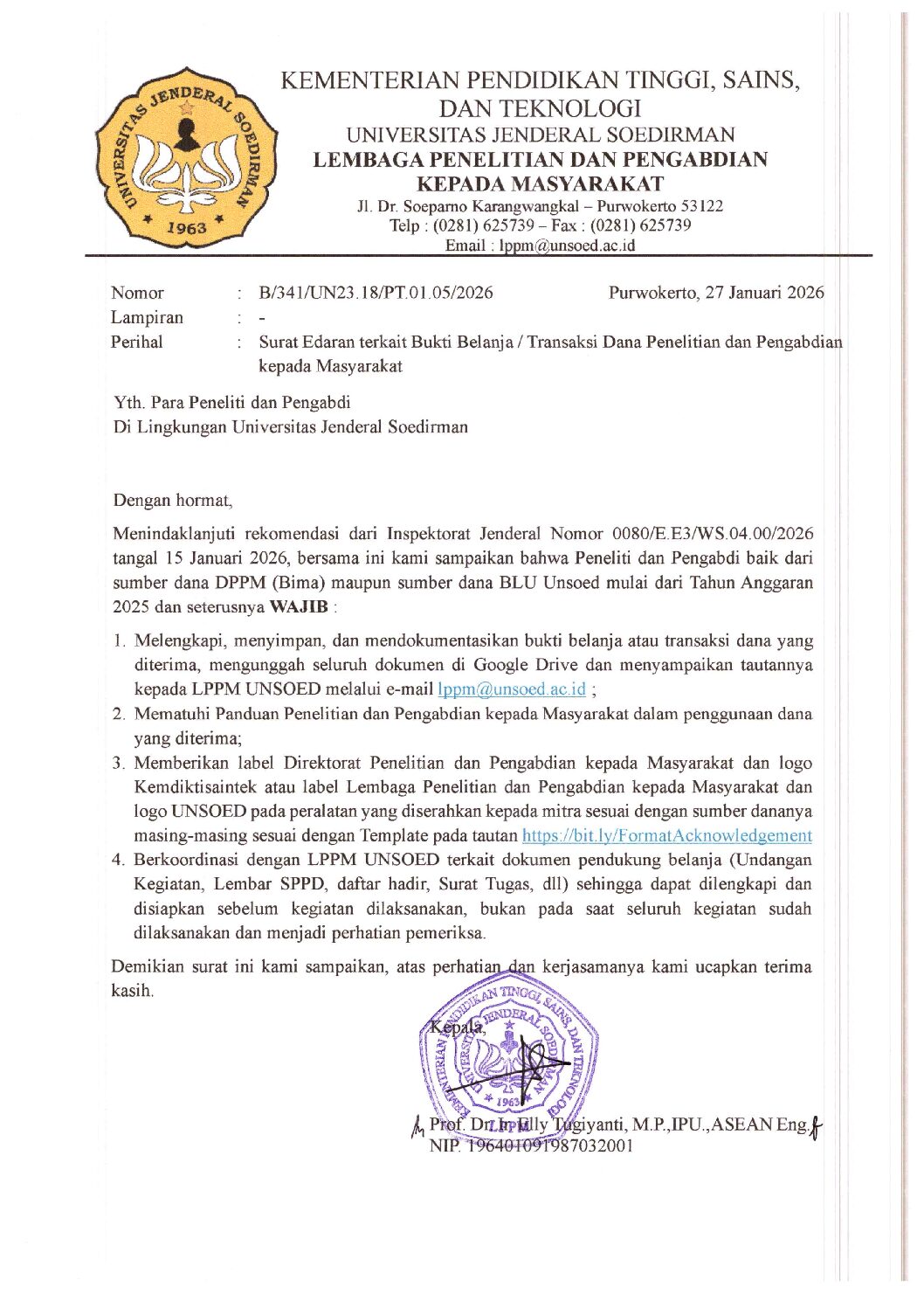 Menindaklanjuti rekomendasi dari Inspektorat Jenderal Nomor 0080/E.E3/WS.04.00/2026 tangal 15 Januari 2026, bersama ini kami sampaikan bahwa Peneliti dan Pengabdi baik dari sumber dana DPPM (Bima) maupun sumber dana BLU Unsoed mulai dari Tahun Anggaran