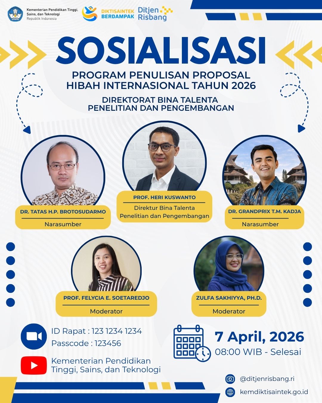 Direktorat Bina Talenta Penelitian dan Pengembangan Kementerian Pendidikan Tinggi, Sains dan Teknologi mengundang anda dalam Sosialisasi Program Penulisan Proposal Hibah Internasional Tahun 2026.