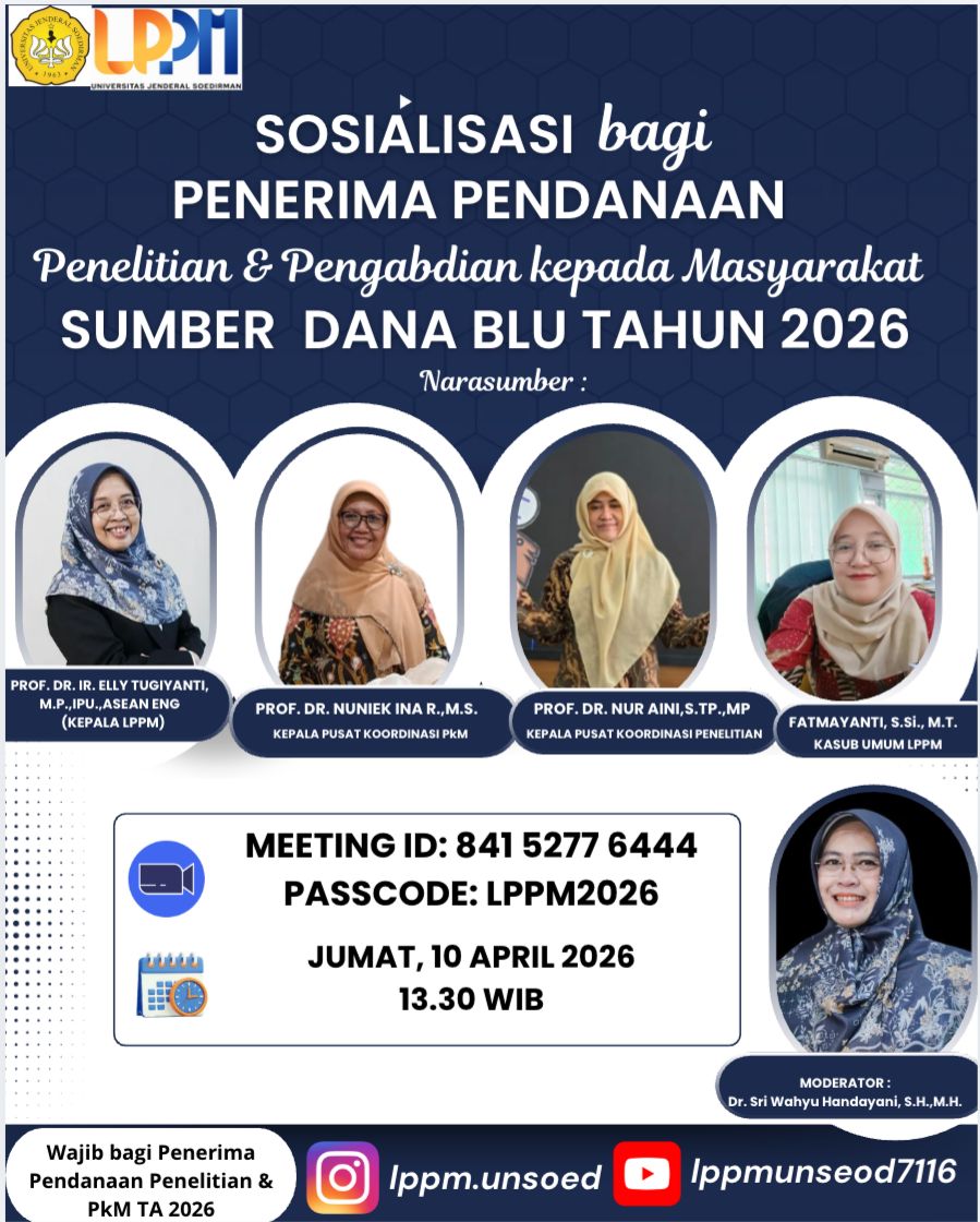 Sehubungan akan diadakannya Sosialisasi Penelitian dan Pengabdian BLU Tahun 2026 secara daring, dengan ini mengundang bapak/Ibu Dosen/Peneliti/Pengabdi penerima dana BLU Batch 1 dan batch 2 untuk mengikuti acara tersebut yang akan dilaksanakan secara daring pada